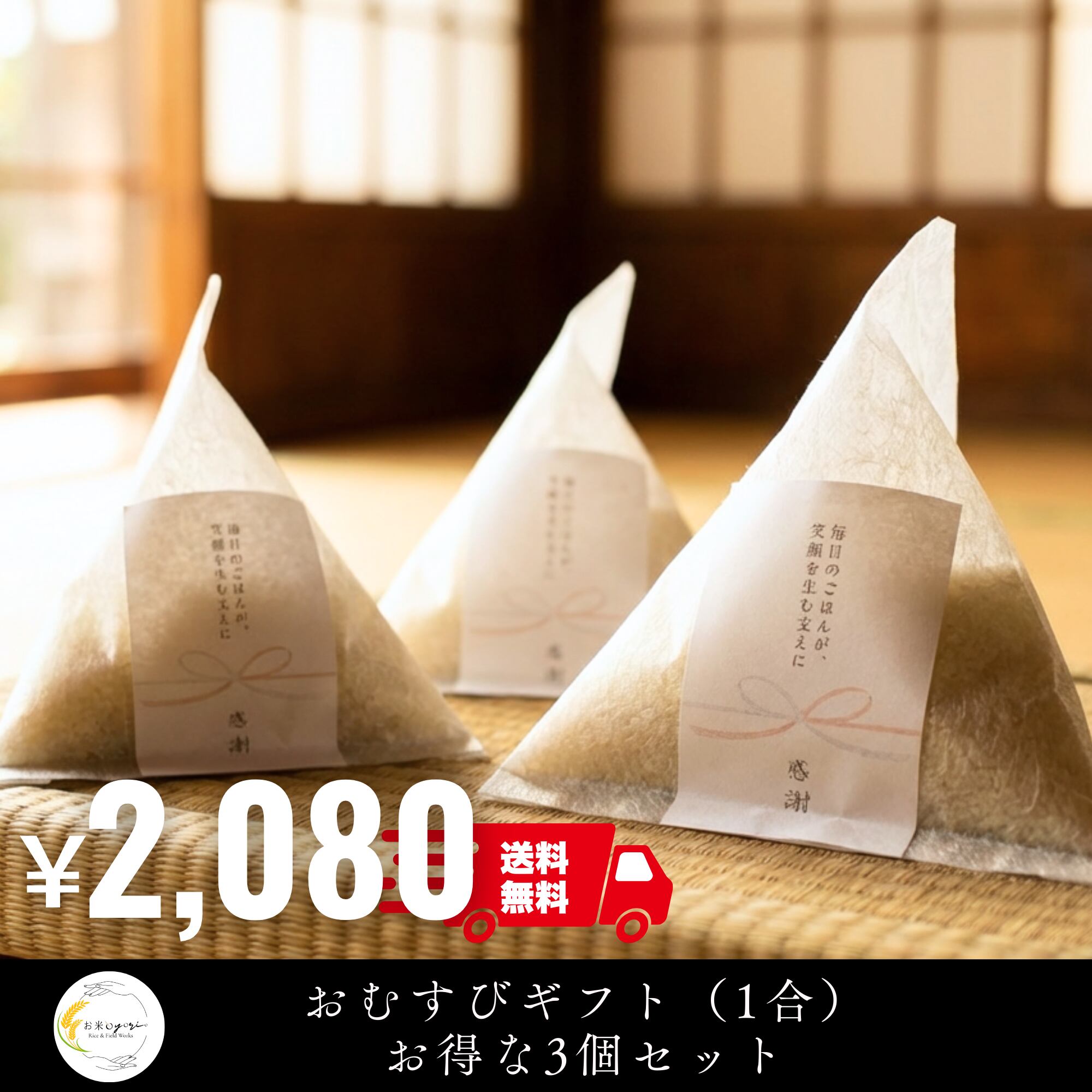 おむすび型の立体パッケージに包んだ、特別感のあるプチ米ギフト3個セットです。